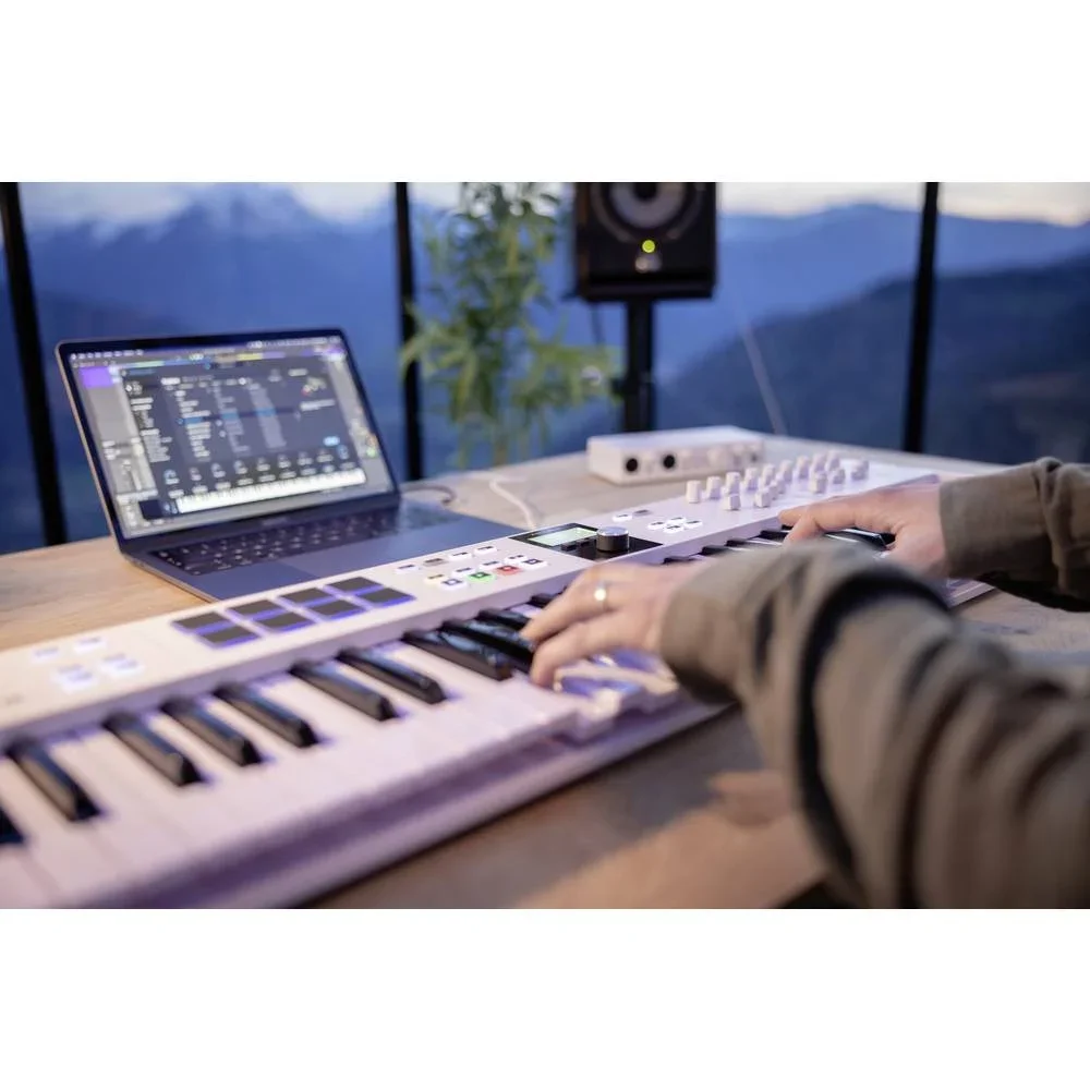 Dank Chord- und Scale-Modus, Arpeggiator und Pitch/Mod-Rädern lässt sich Musik spielerisch und expressiv formen. Das 2,5" LC-Display sorgt für klare Übersicht, während die Kombination aus Fadern, Drehreglern und einem gerasterten Encoder eine präzise Steuerung von DAWs, Plug-ins und externer Hardware ermöglicht. Über den USB-C-Port werden MIDI-Daten sowie Strom effizient übertragen – ganz ohne zusätzliches Netzteil.