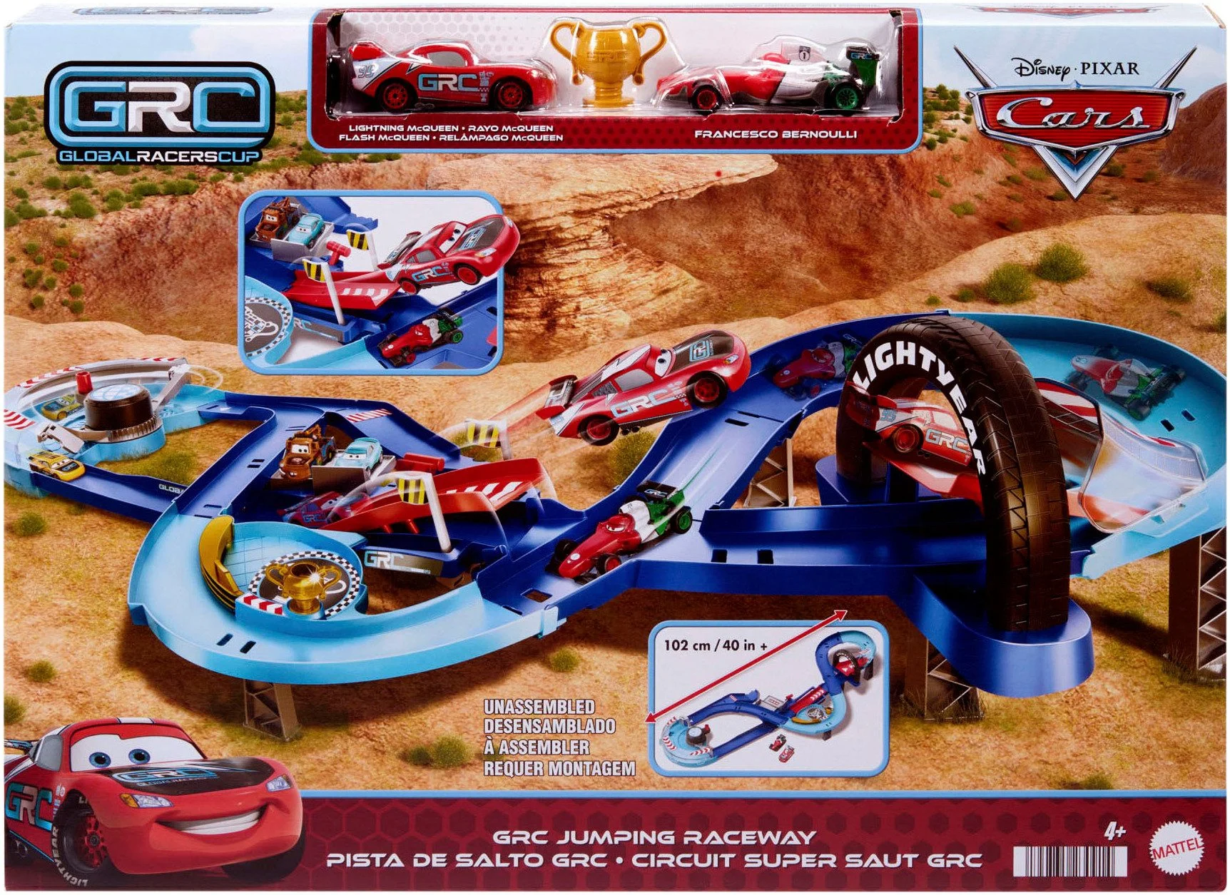 Highlights: Spektakulärer Sprung-Stunt, klassische Cars-Charaktere, manuelles Rennerlebnis ohne Batterien, bewegliche Elemente und sofort spielbereit dank enthaltener Fahrzeuge.