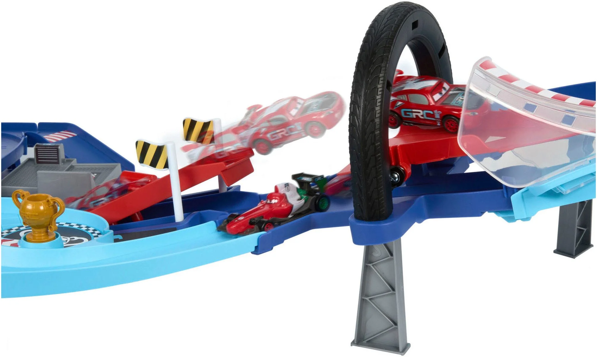 Rennstrecke mit Stunt-Sprung, 2 Spielzeugfahrzeuge (Lightning McQueen & Francesco Bernoulli), Bewegliche Schranken, Trophäe |