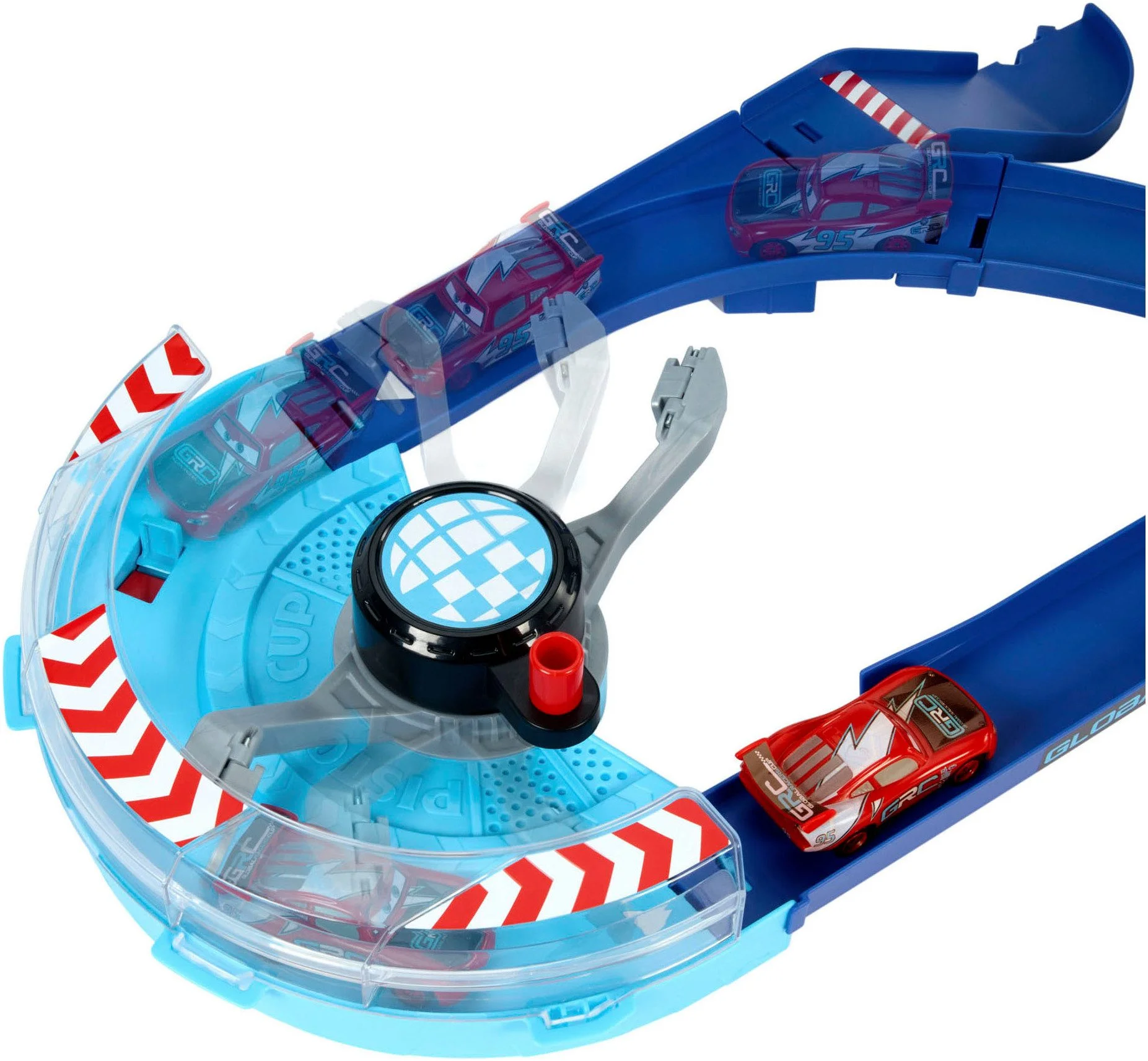 Auf der Disney Pixar Cars GRC Sprung-Rennstrecke liefern sich die Kultcharaktere Lightning McQueen und Francesco Bernoulli spannende Kopf-an-Kopf-Duelle! Das dynamische Rennset begeistert mit engen Kurven, überkreuzten Streckenabschnitten und einem spektakulären Stunt-Sprung, der den Rennen eine extra Portion Nervenkitzel verleiht.