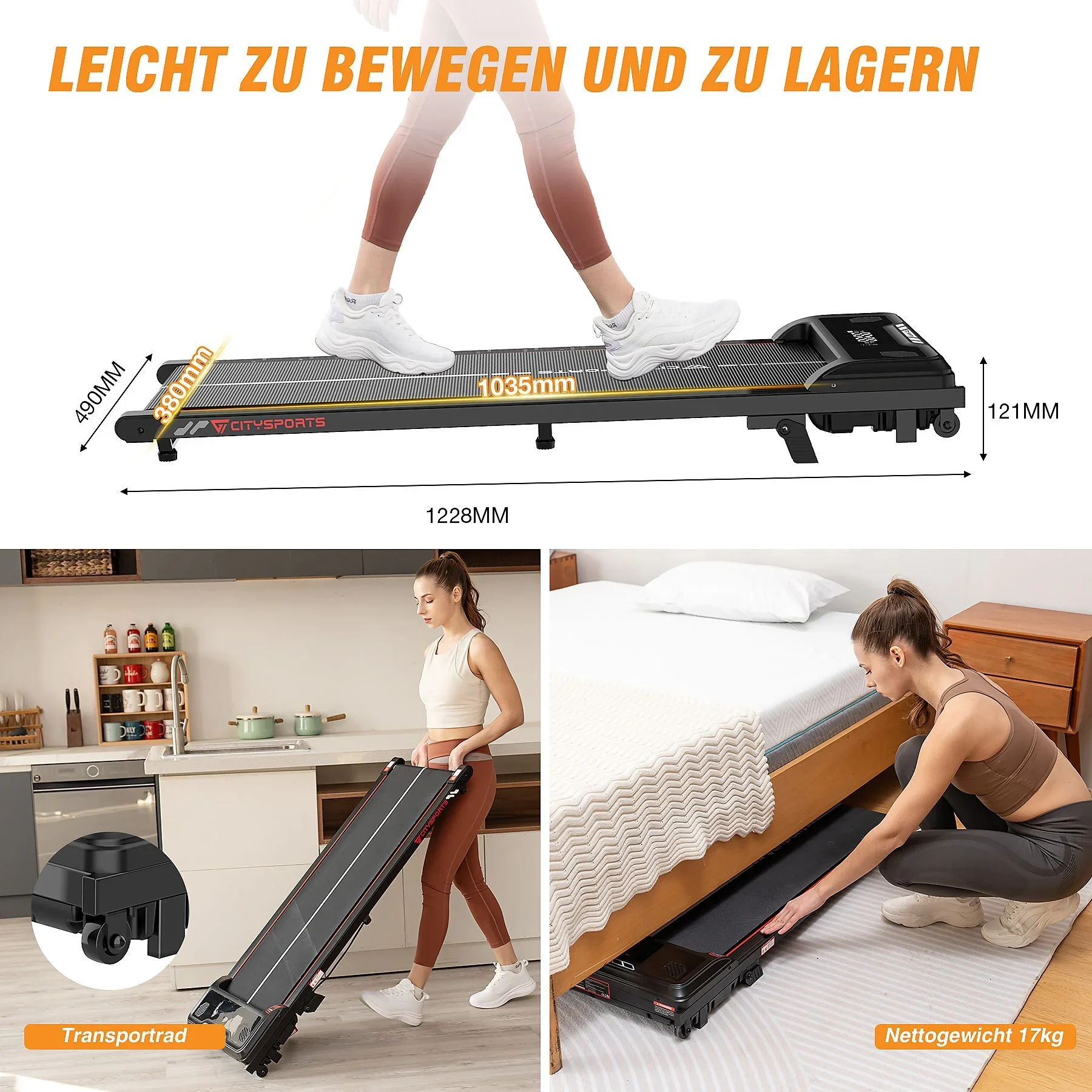 Mit nur 17 kg, einer Lauffläche von 400 × 1030 mm und integrierten Transportrollen ist das WP6 äußerst leicht zu bewegen und zu verstauen – unter dem Bett, Sofa oder Schreibtisch. Der 440-W-Motor arbeitet leise und bietet dank Anti-Rutsch-Lauffläche und Stoßdämpfung hohen Trainingskomfort. Das LED-Display zeigt alle relevanten Trainingsdaten an, während die Fernbedienung eine schnelle Anpassung der Geschwindigkeit ermöglicht.
