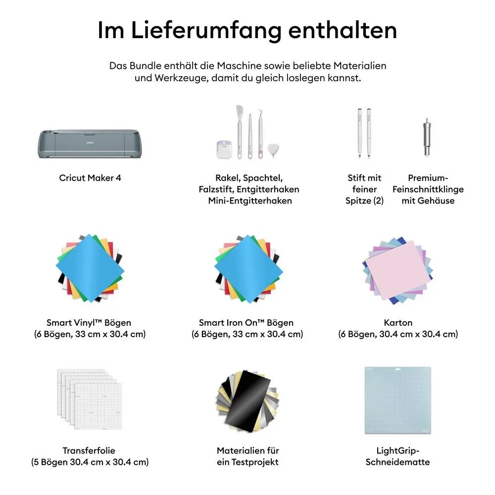 Cricut Maker 4, Premium-Feinschnittklinge + Gehäuse, LightGrip-Matte (30,4 × 30,4 cm), Stift 0,4 mm (Feinspitze), Mini-Entgitterhaken, Materialien für ein Testprojekt, Essentials-Bundle: Falzstift (Flieder), Rakel (Flieder), Spachtel (Minze), Entgitterhaken (Rosé), Stift 0,4 mm (Magenta), Smart Iron-On™ – 6 Bögen (Schwarz, Weiß, Blau, Grün, Rot, Gelb), Smart Vinyl™ Permanent – 6 Bögen in denselben Farben, Karton-Musterset „Meerjungfrau“, Transferfolie (5 Bögen, 30,4 × 30,4 cm) |