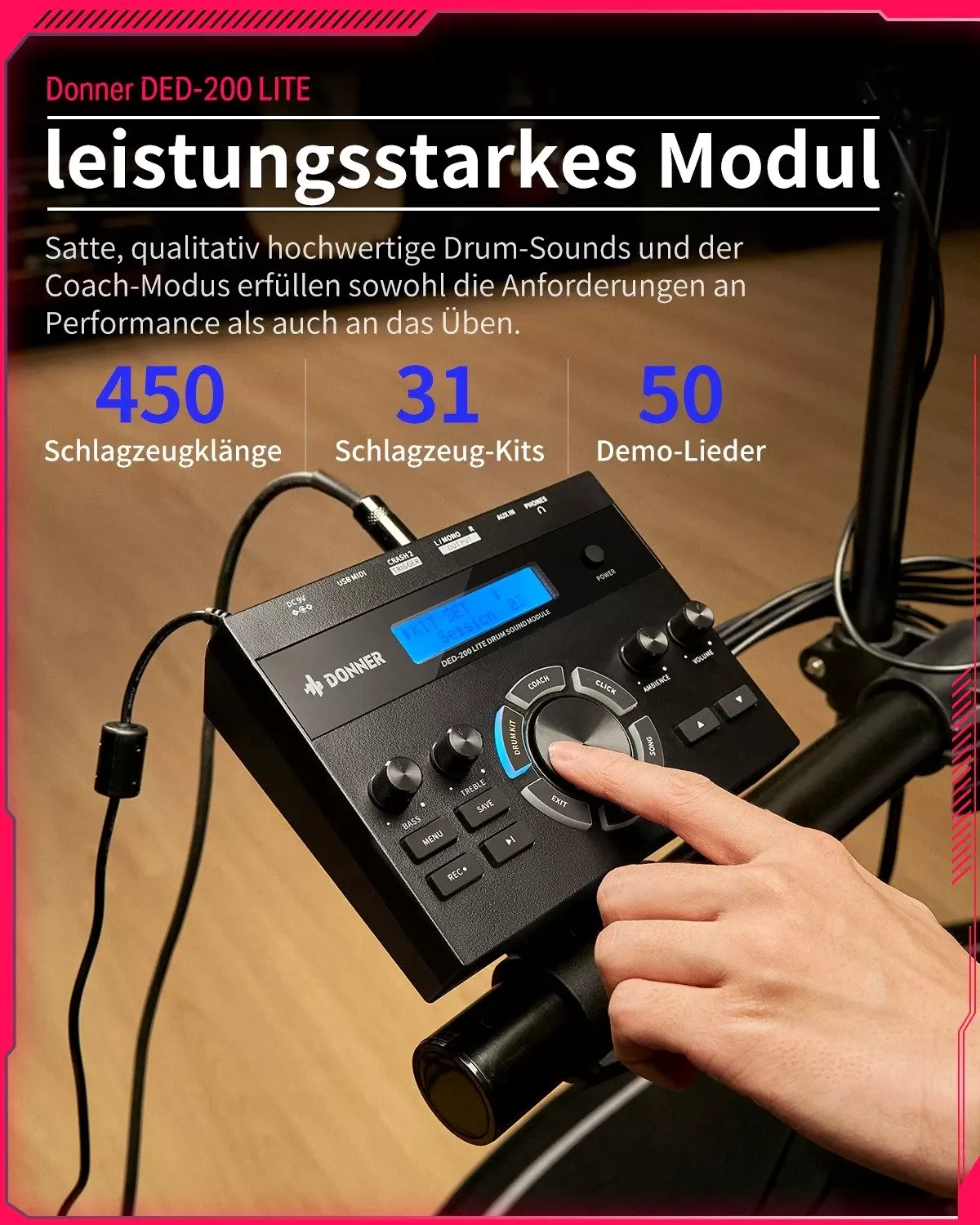Das Donner DED-200 E-Drum Set bietet realistisches Spielgefühl dank hochwertiger Mesh Drumheads und umfangreicher Funktionen für Anfänger und Fortgeschrittene. Mit 450 Sounds, 31 Drumkits und 50 Play-Along-Tracks erhältst du ein komplettes Setup zum Üben, Aufnehmen und Performen. Dank integrierter Lerntools, USB-MIDI und Kopfhöreranschluss ist das DED-200 ideal für leises Üben und vernetztes Musizieren zu Hause.