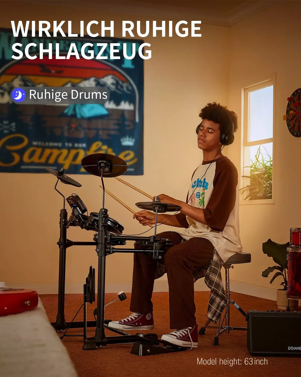 Leises, kompaktes E-Drum-Set für Anfänger mit Mesh-Pads, Lernfunktion und Kopfhörern