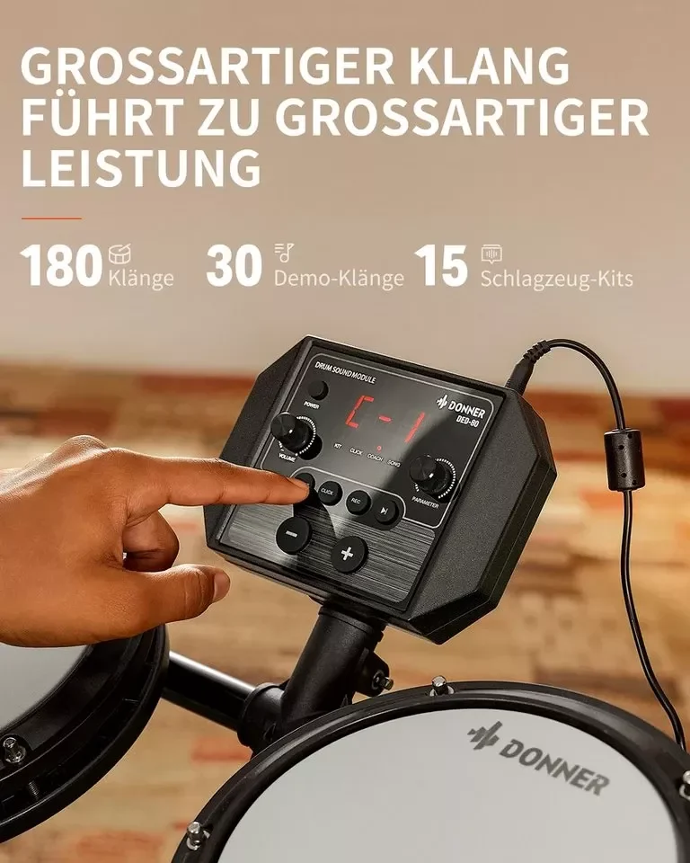Das Donner DED-80 E-Drum-Set bietet Anfängern ein vollwertiges elektronisches Schlagzeug mit realistischem Spielgefühl, dank hochdichter doppellagiger Mesh-Pads. Mit 180 Sounds, 15 Drumkits und 30 Demosongs deckt es verschiedene Musikstile ab und ermöglicht ein dynamisches, lautloses Üben per Kopfhörer. Durch die USB-MIDI-Schnittstelle lässt sich das Set mit DAW-Software verbinden – ideal zum Üben, Aufnehmen oder Komponieren zu Hause.