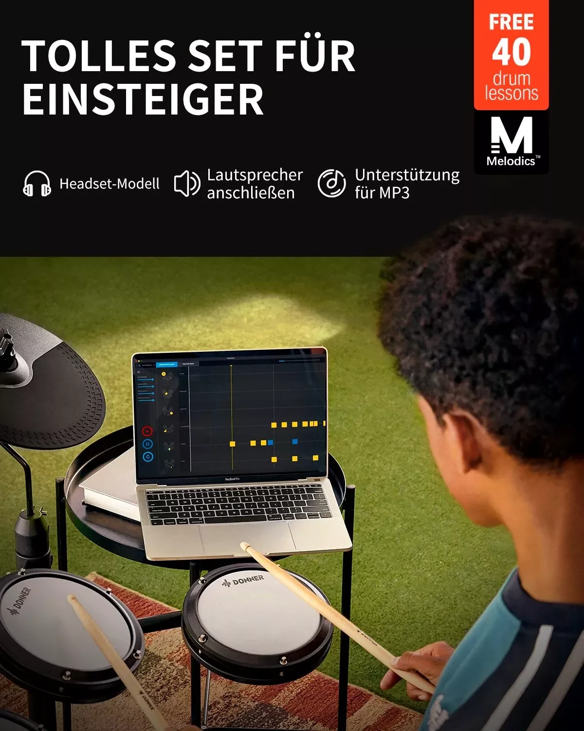 Besonderheiten: Doppellagige Mesh-Pads für realistisches Spielgefühl, kompakt und faltbar, USB-MIDI-Anbindung, Lernfunktionen, inklusive Zubehör und kostenlosem Unterricht.