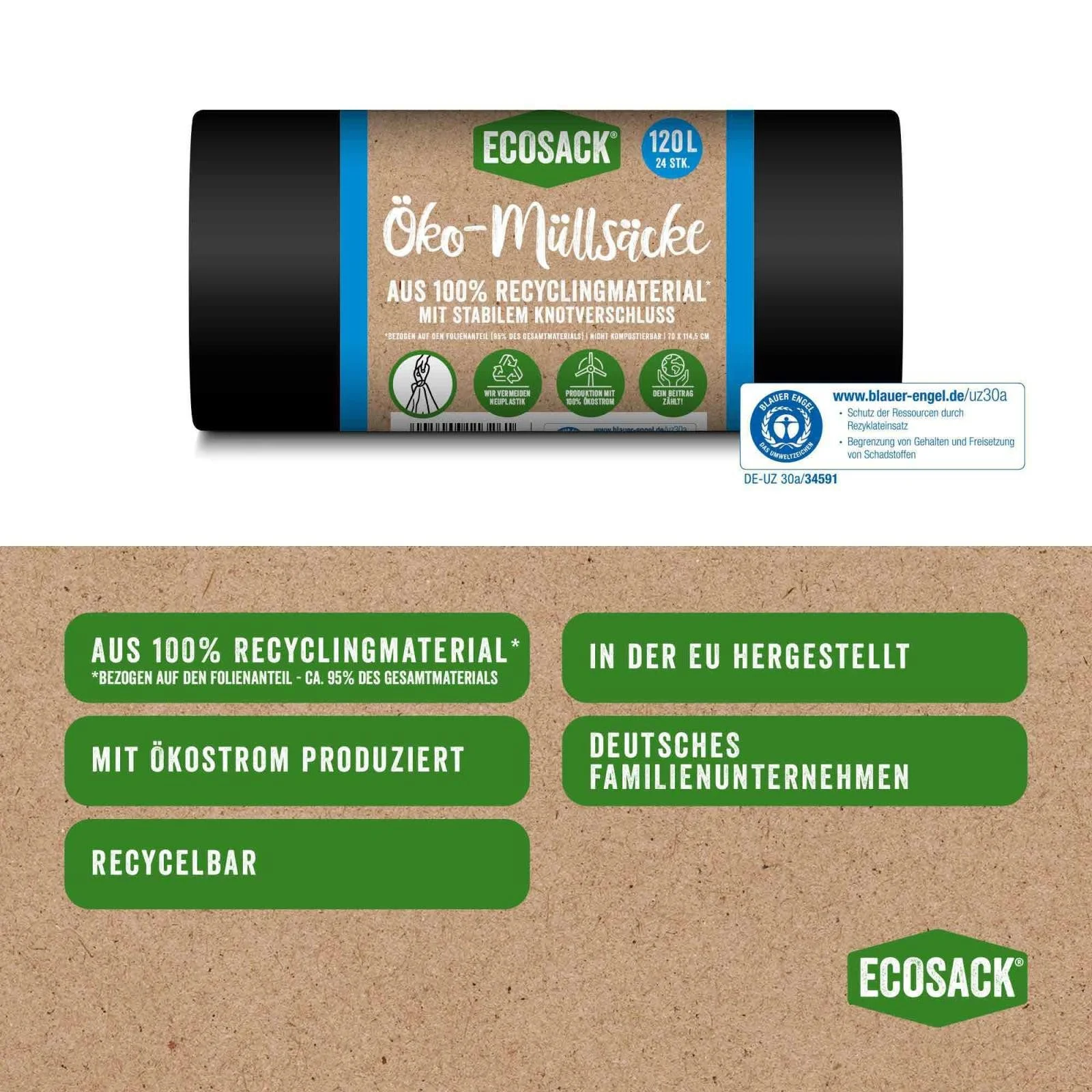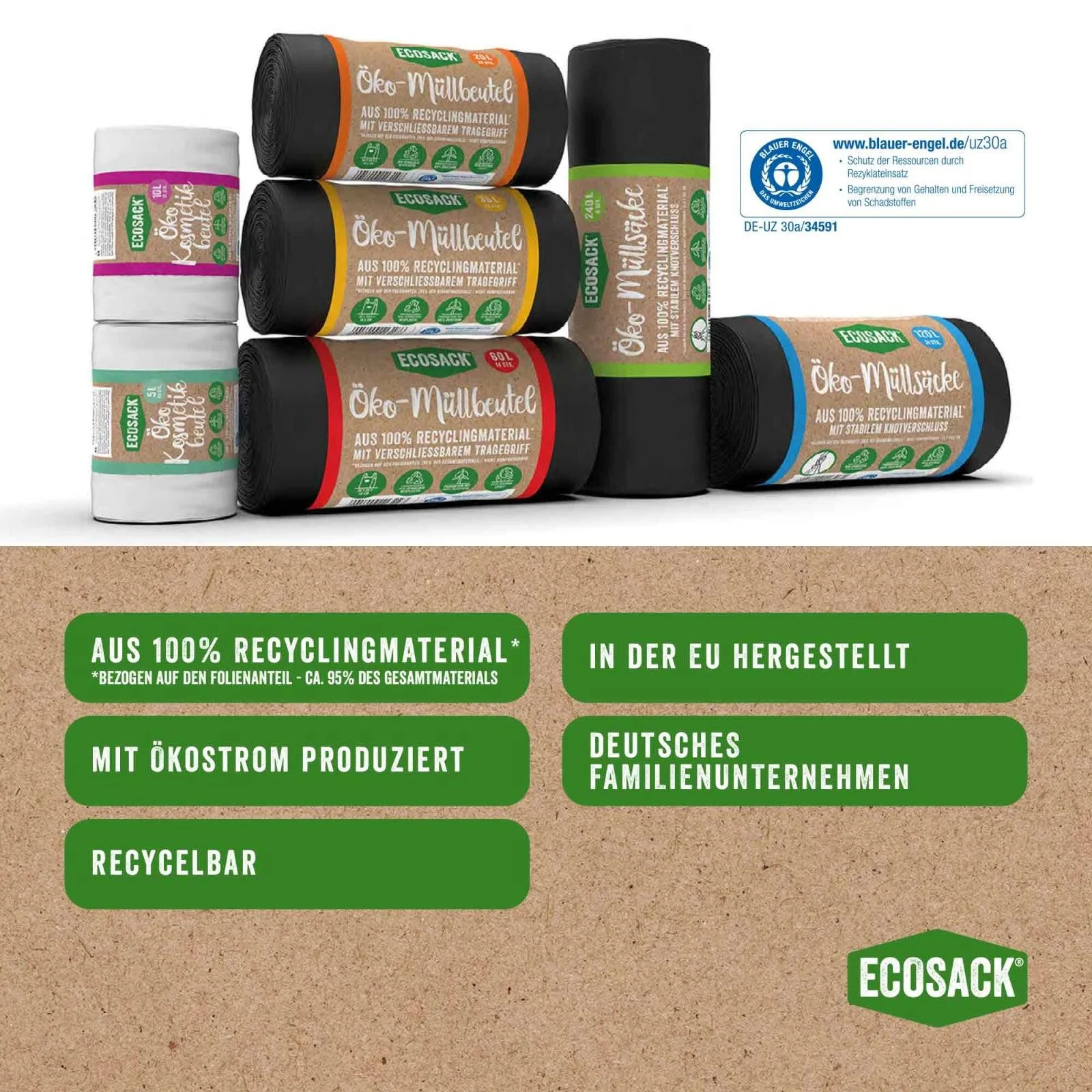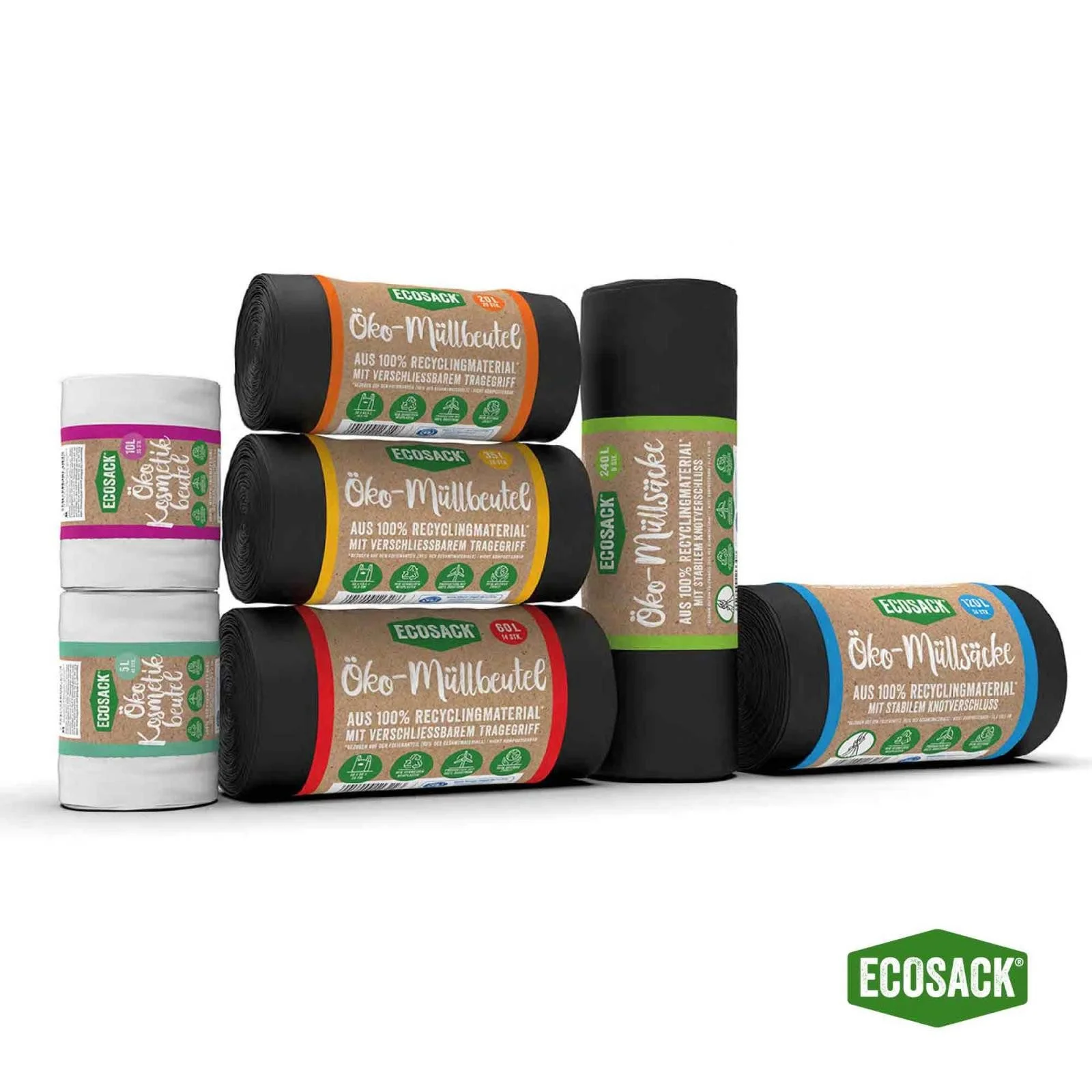 Nachhaltige Müllentsorgung leicht gemacht: Die ECOSACK Müllbeutel werden mit 100% Ökostrom in der EU produziert und bestehen aus recyceltem Folienmaterial. Sie sind blickdicht, reißfest, tropfsicher und ideal für Haushalte, Betriebe, Gastronomie und Außenbereiche.