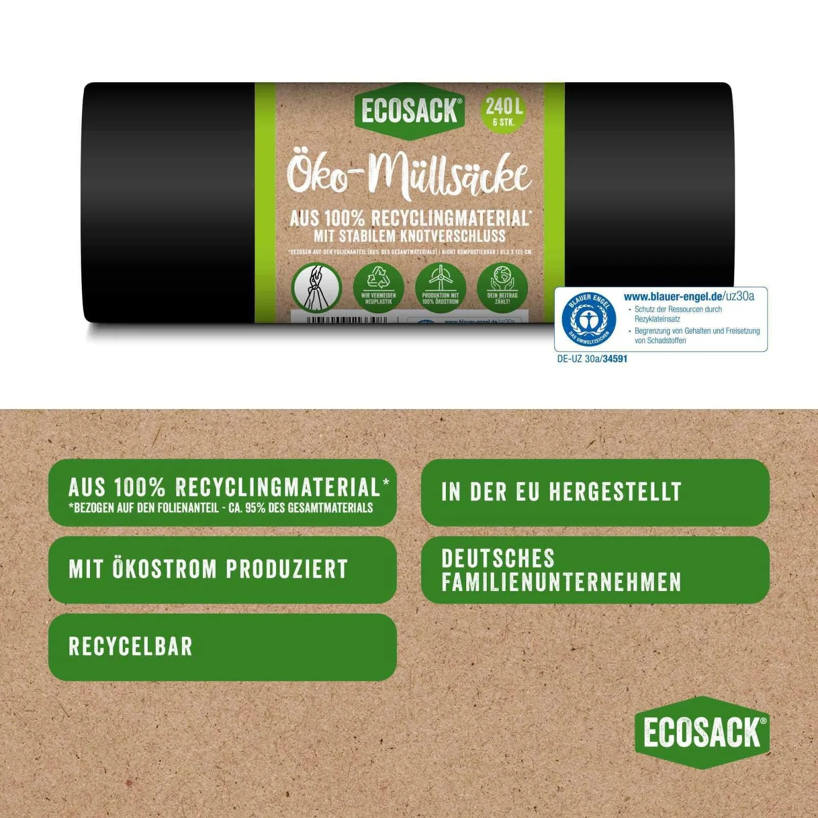 Die ECOSACK Müllbeutel sind die nachhaltige und zuverlässige Lösung für große Mülltonnen bis 240 Liter. Hergestellt aus 100% Recyclingmaterial (bezogen auf den Folienanteil) und produziert mit 100% Ökostrom in der EU. Die Beutel sind blickdicht, reißfest, tropfsicher und verhindern zuverlässig unerwünschte Gerüche und Einsicht in den Müll. Ideal für Haushalt, Gewerbe, Gastronomie und Außenbereiche.