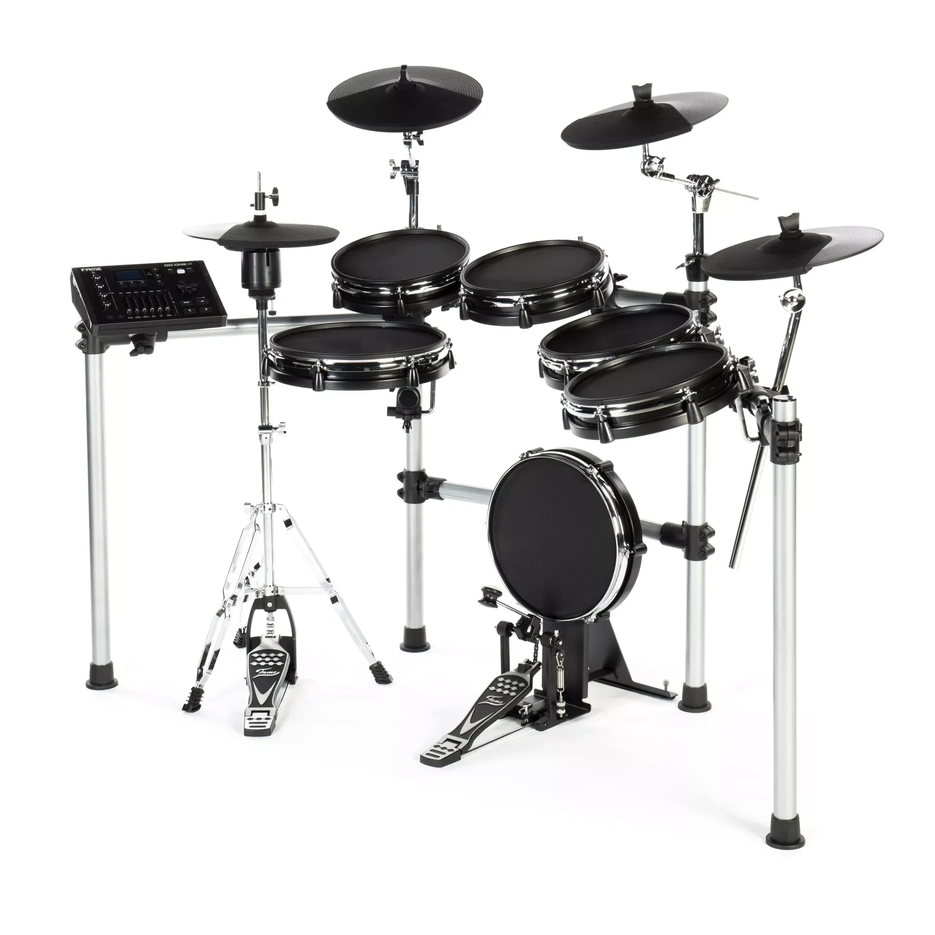 Lieferumfang: DD-ONE Professional XT Modul, Snare, Toms, Kick Pad, HiHat, Cymbals, Rack, Fußmaschine, Netzteil, Kabelbaum, Sticks, Y-Kabel.