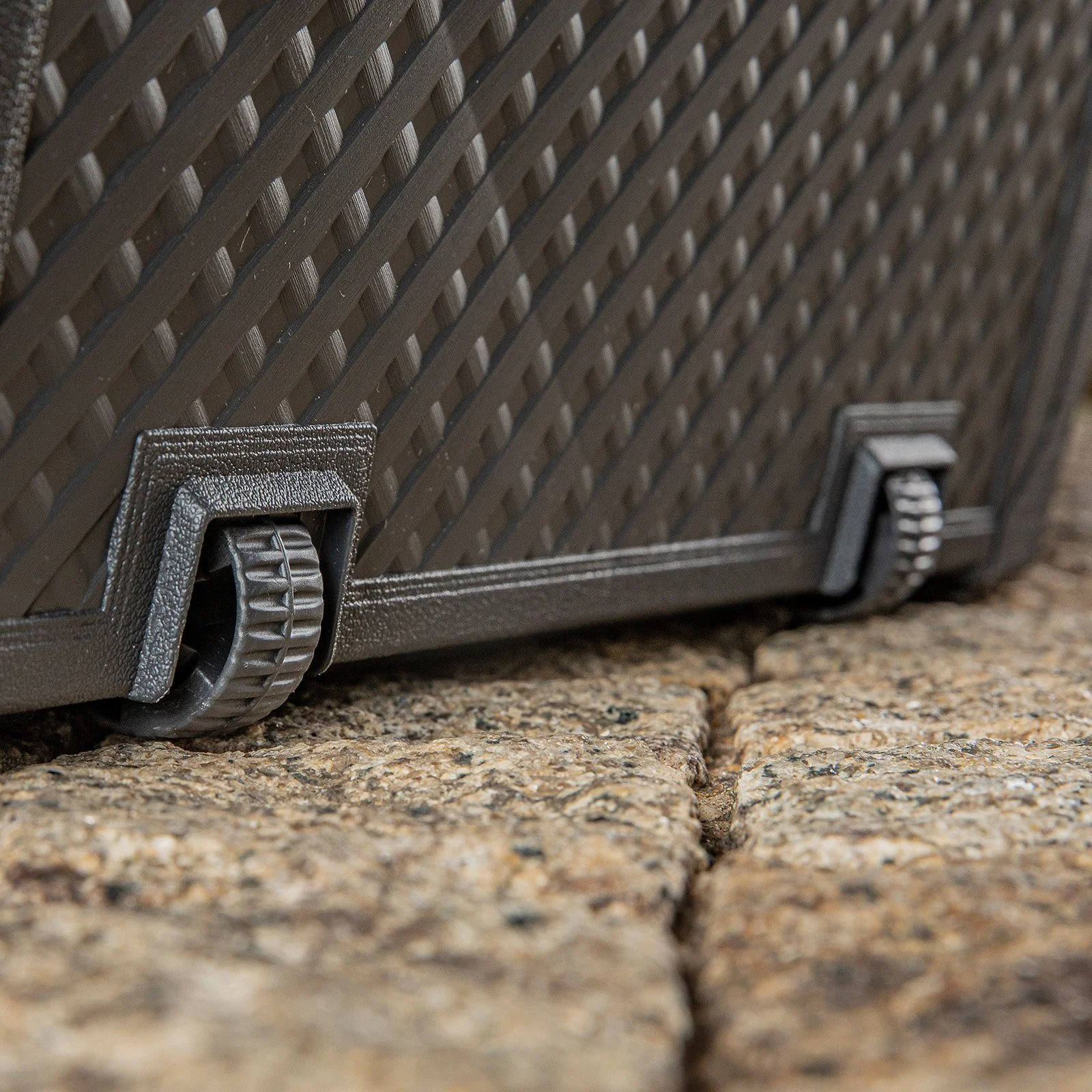 Für den einfachen Transport ist die Box mit integrierten Griffen und Rollen ausgestattet. Zudem kann sie mit einem Vorhängeschloss (nicht enthalten) abgeschlossen werden.