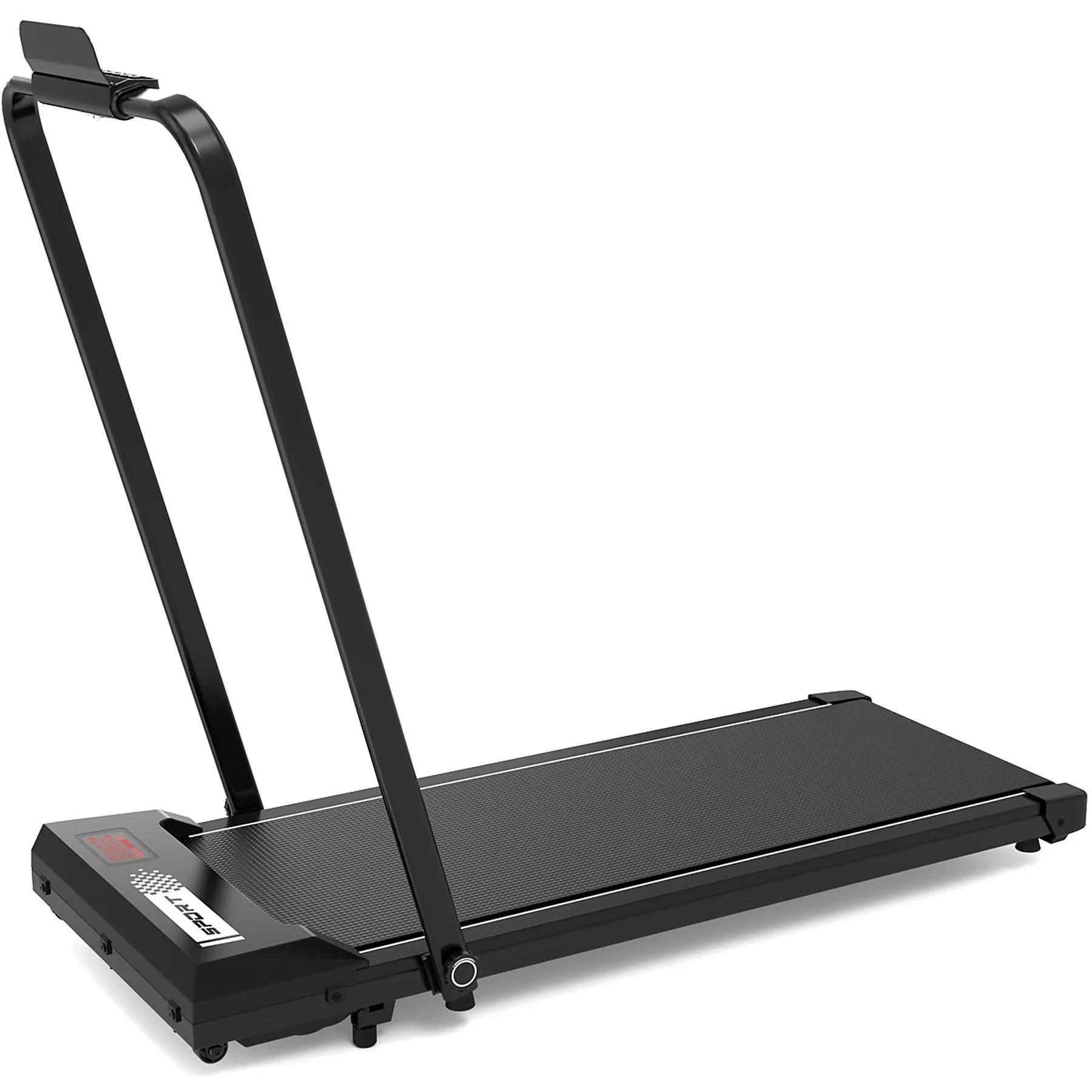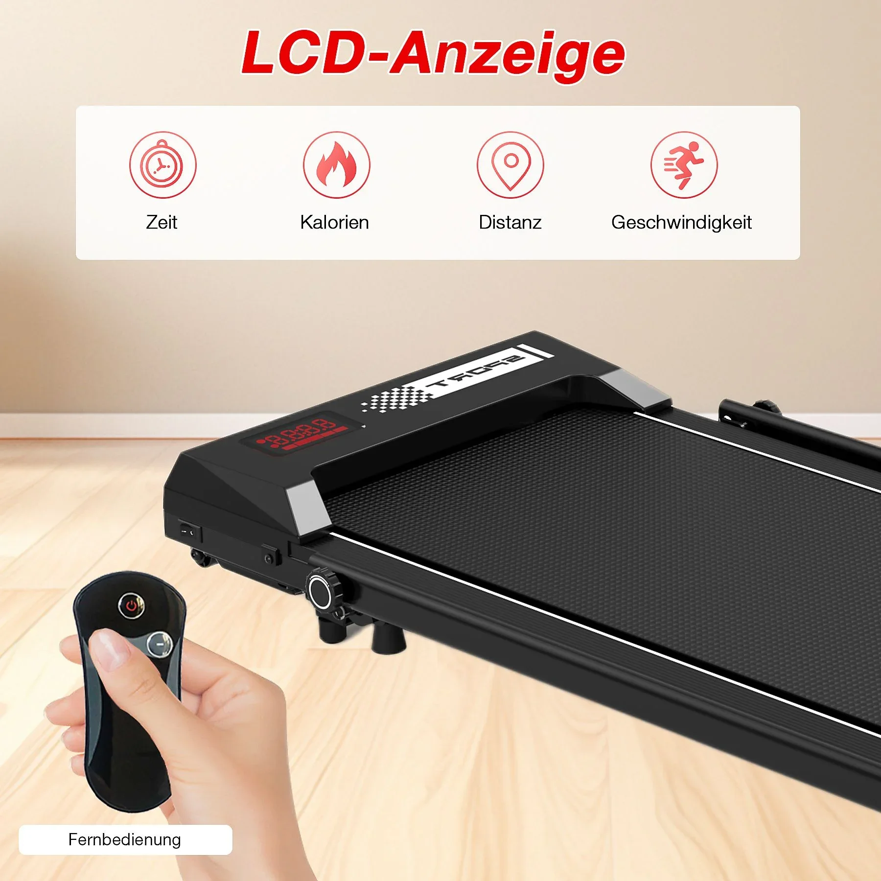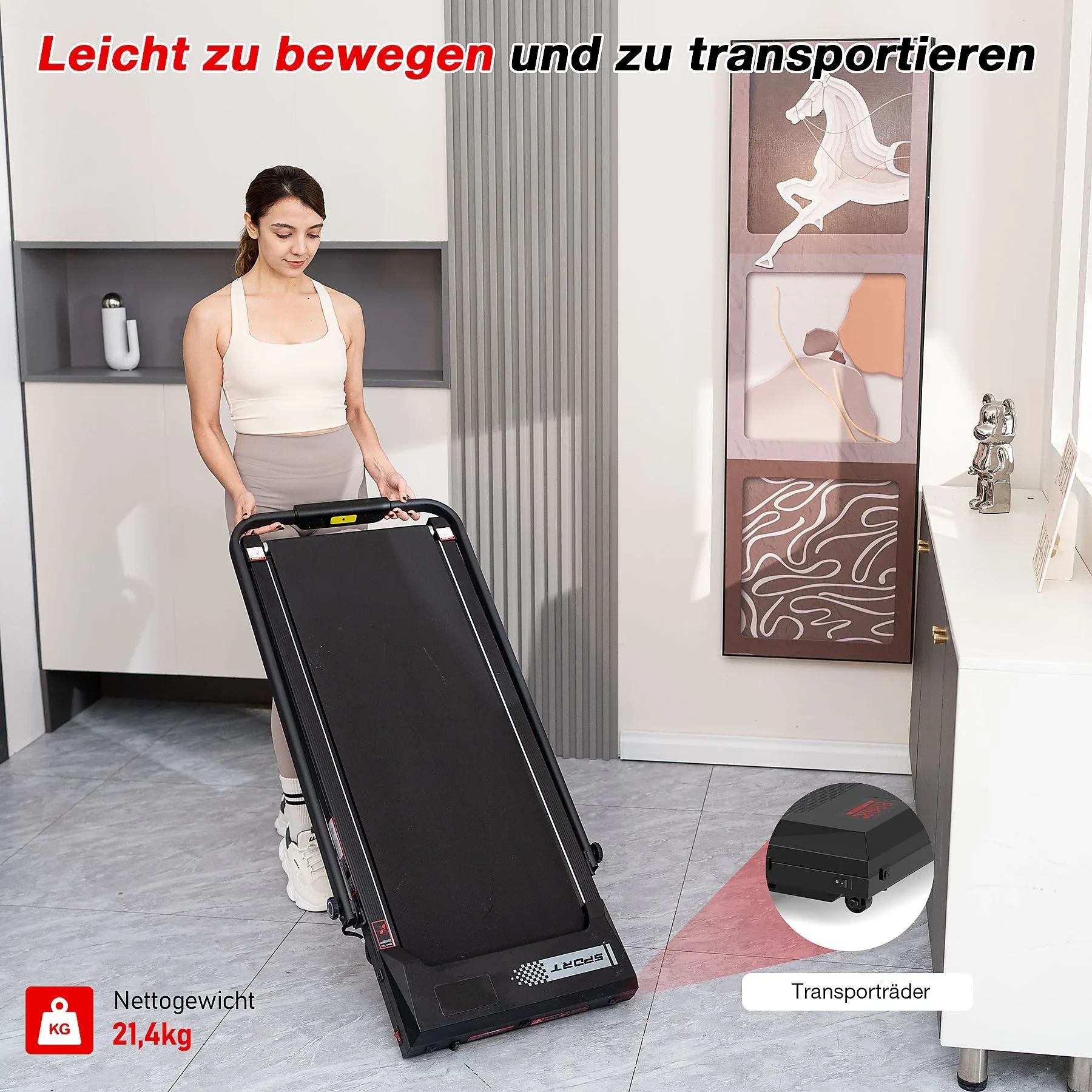 Dank der klappbaren Armlehnen lässt sich das Gerät sowohl als klassisches Laufband (1–12 km/h) als auch als Untertisch-Laufband zum Gehen (1–6 km/h) nutzen. Das LCD-Display sowie die Fernbedienung ermöglichen eine einfache Steuerung und klare Übersicht über Geschwindigkeiten, Zeiten, Distanzen und Kalorien. Das Laufband ist sofort einsatzbereit, benötigt keine Montage und lässt sich dank seiner flachen Bauweise mühelos verstauen.