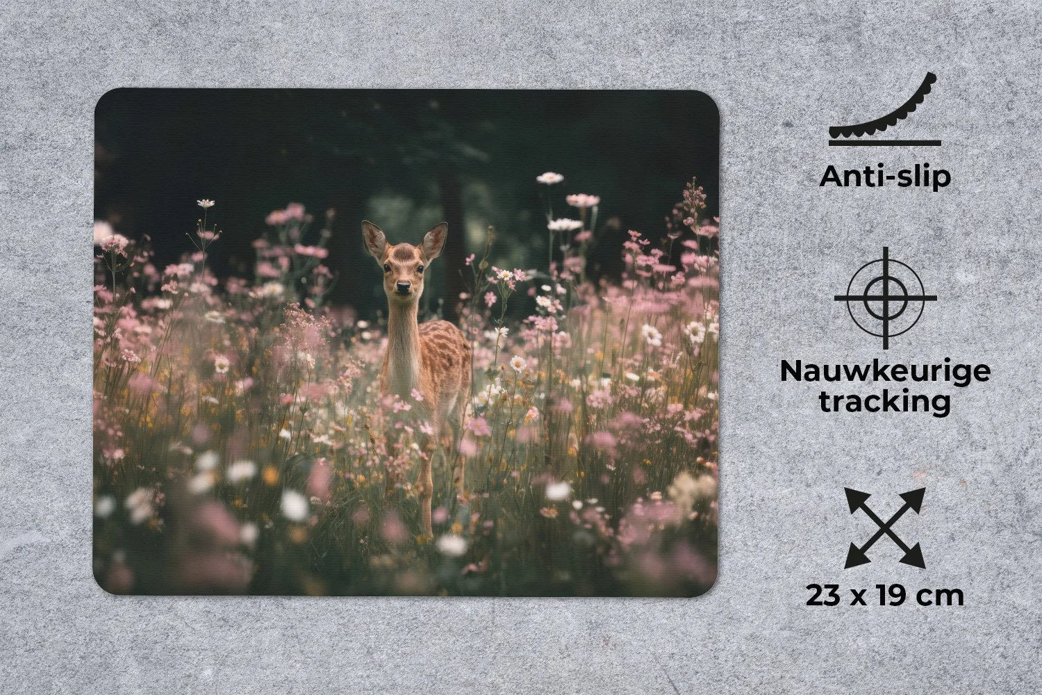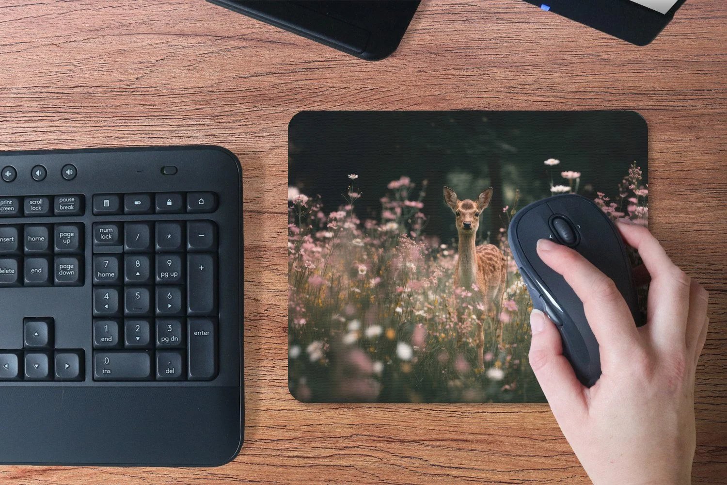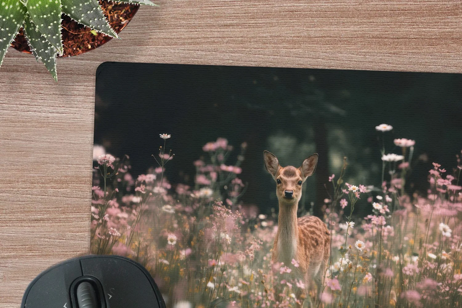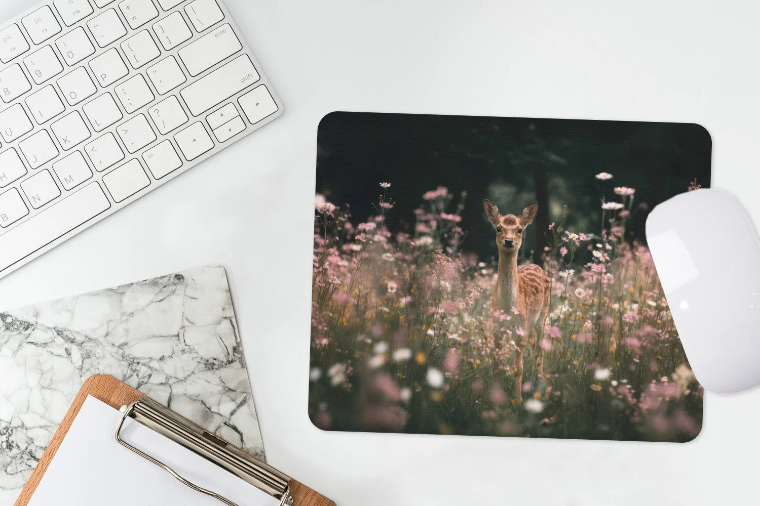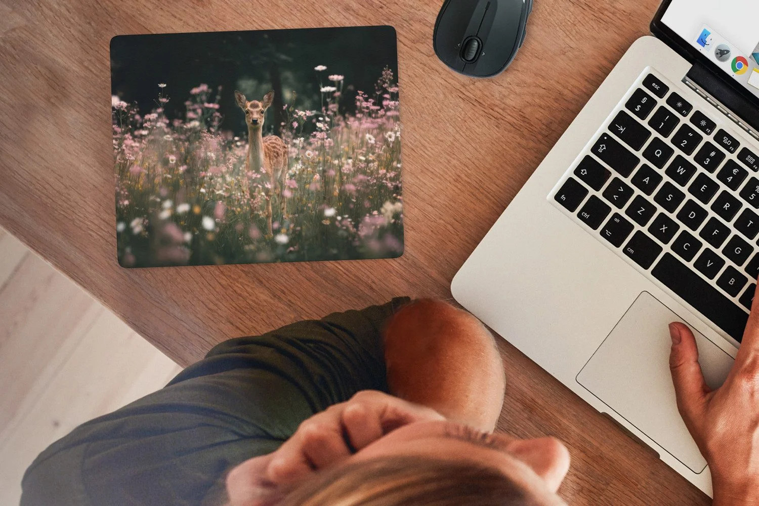 Hochwertiges Mauspad mit naturinspiriertem Druck: Ein Rehkitz umgeben von farbenfrohen Wildblumen vor ruhigem Waldfond. Die Oberfläche bietet optimale Kontrolle und sanftes Gleiten für Büro, Homeoffice und Gaming.