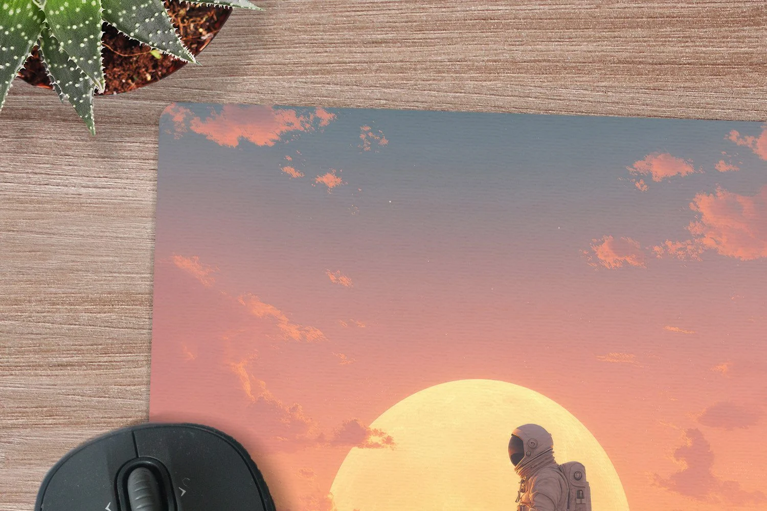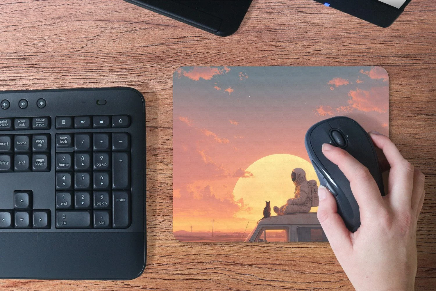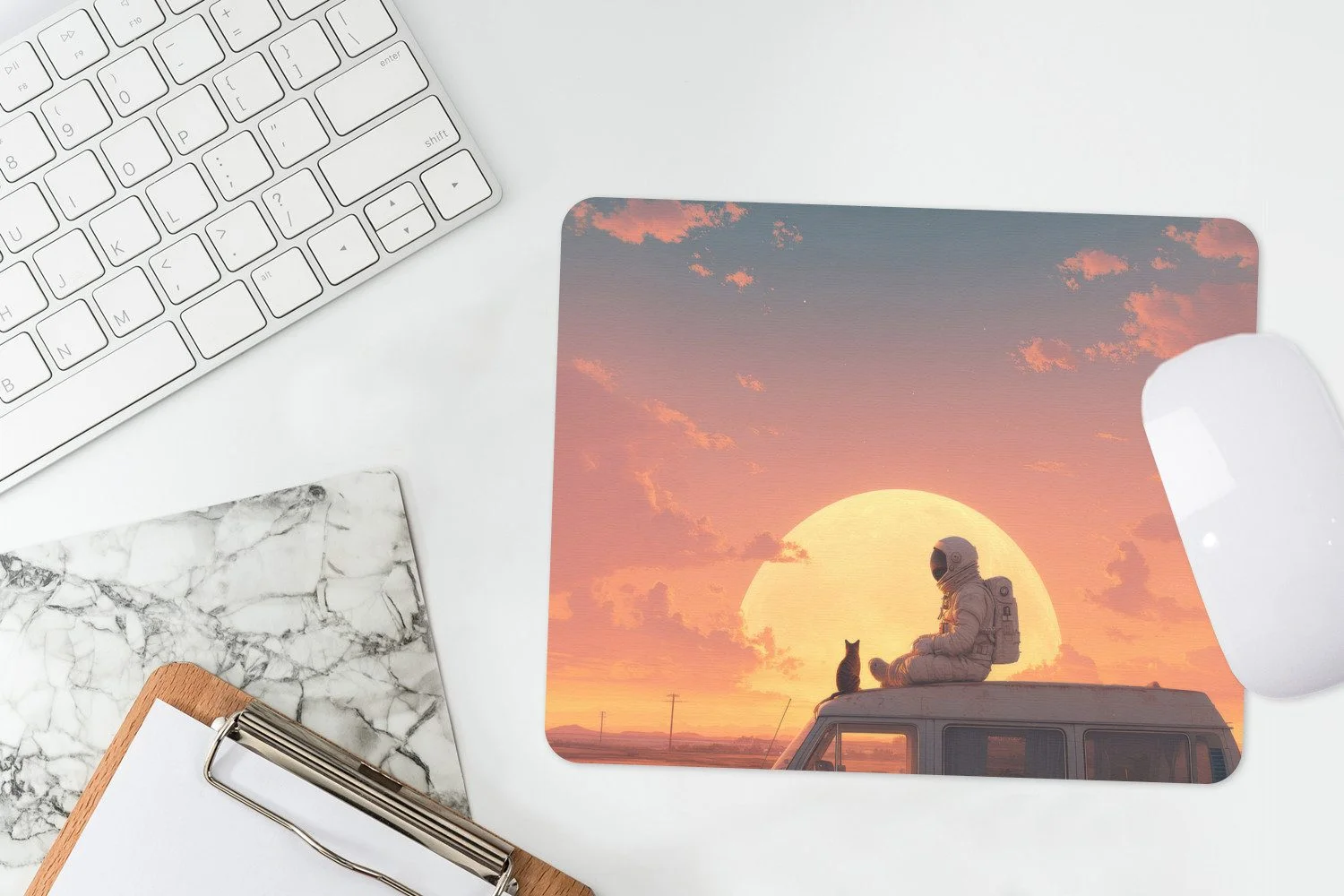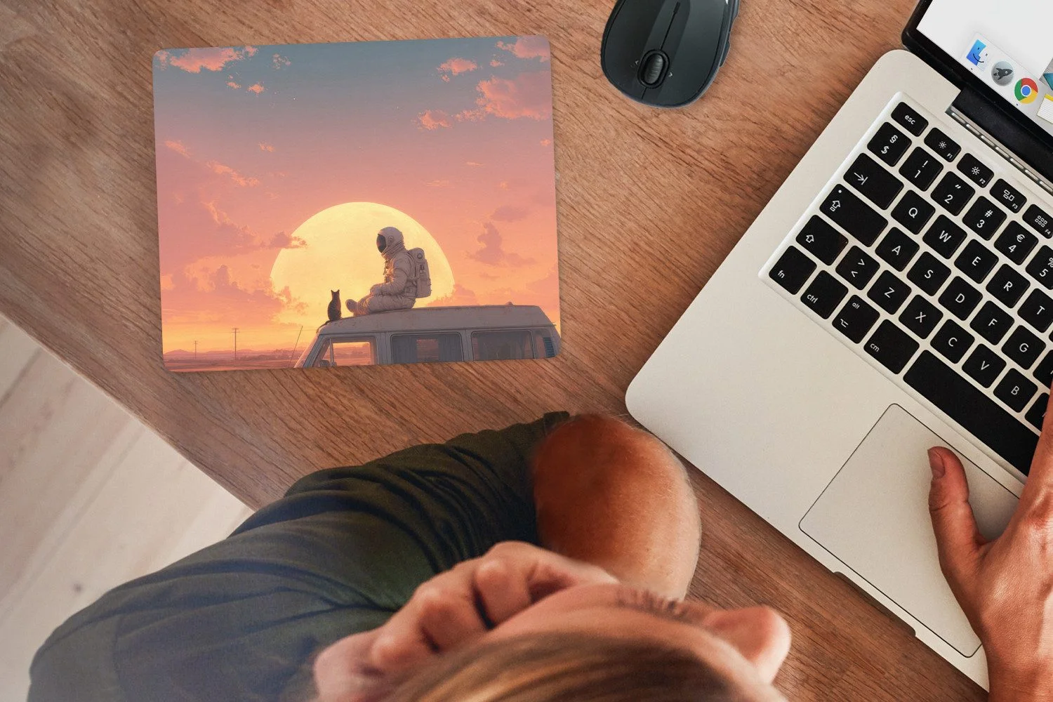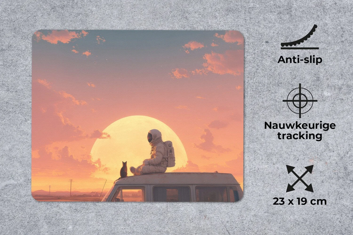 Ein stylisches Mauspad mit farbintensivem Motiv: Ein Van, eine Katze und ein Astronaut vor einem warmen Sonnenuntergang. Ideal für Gaming, Homeoffice, Schule und Arbeitsplatz.