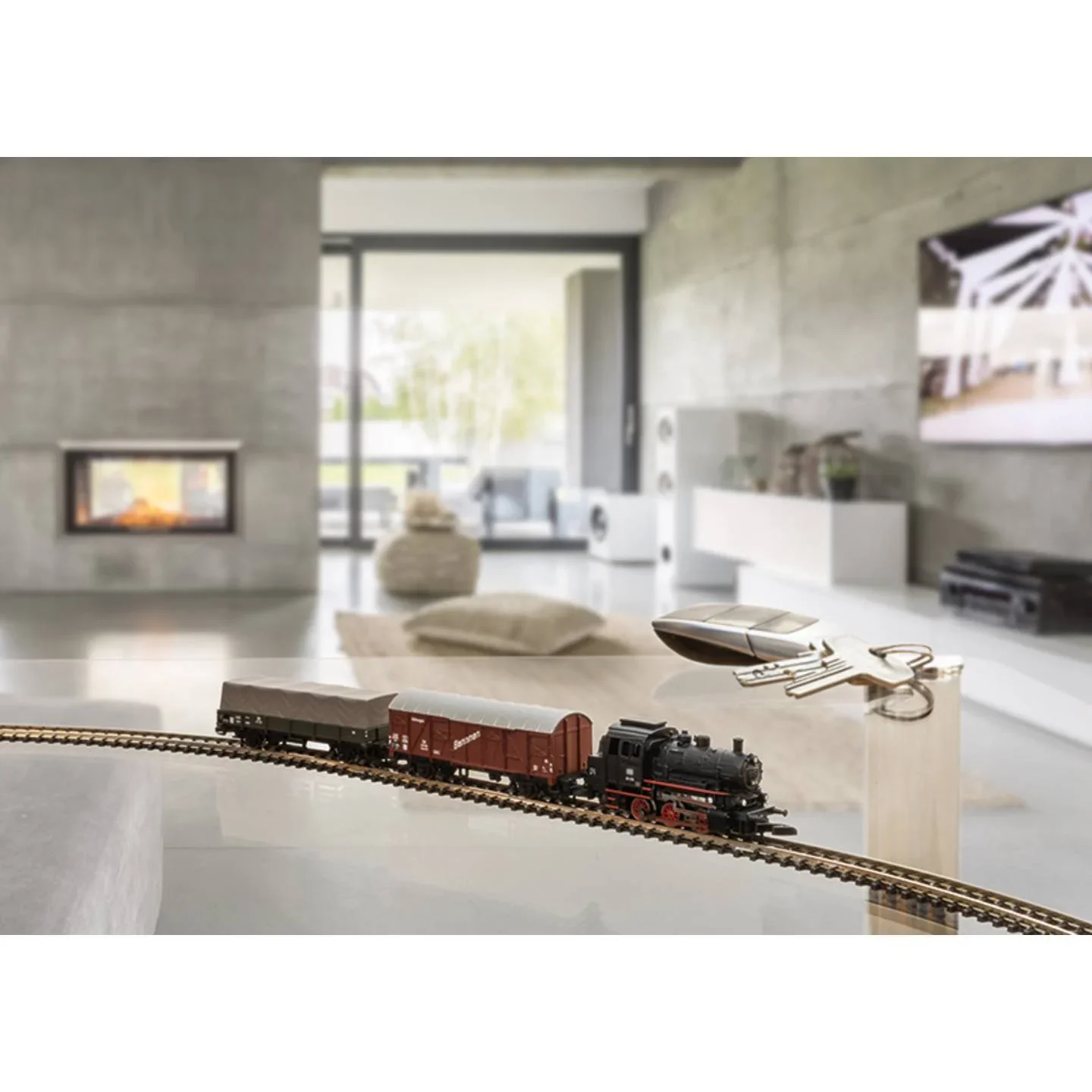Dieses Start-Set bietet Einsteigern die Möglichkeit, direkt in die Welt der Z-Spur Modelleisenbahn einzutauchen und mit einem kompakten Güterzug der DB ihre erste Anlage aufzubauen.