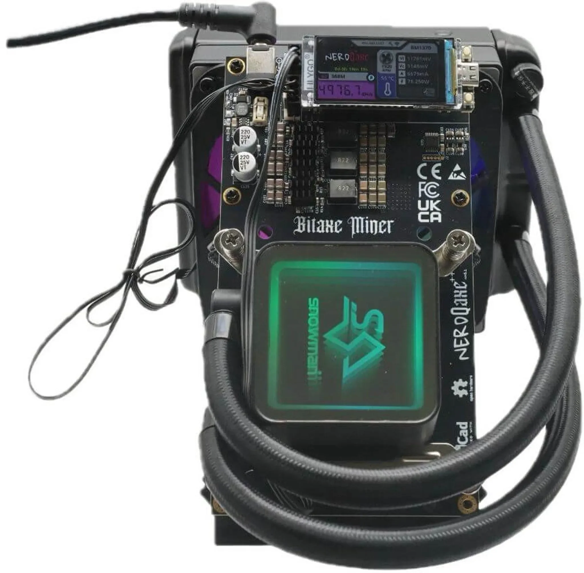 Produktinformationen "NerdQaxe++ Hydro – 4,8 TH/s • Wasserkühlung • Bitcoin Solo Miner • Inkl. Ständer & EU-Netzteil"