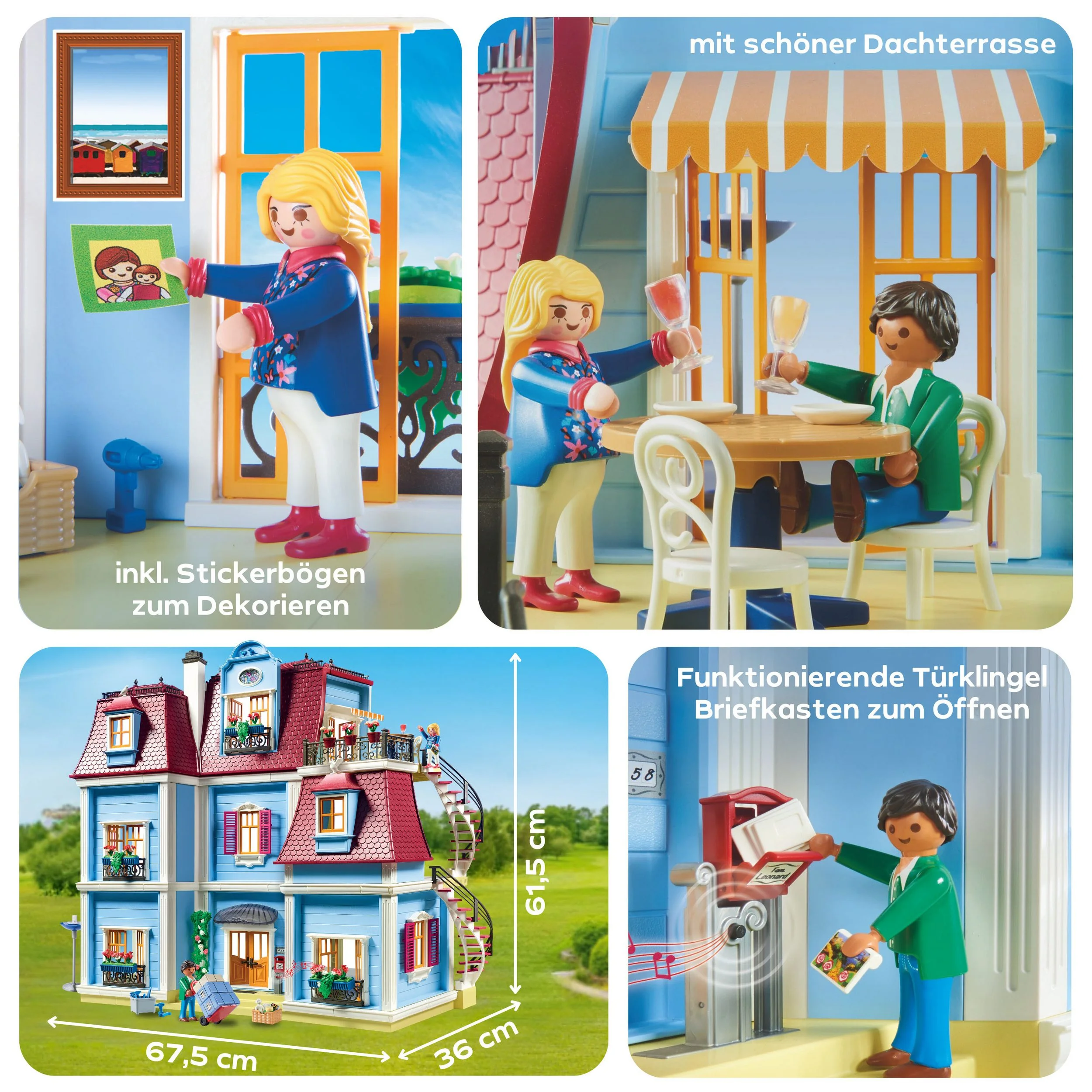 Kinder können mit dem Puppenhaus Alltagsmomente und Fantasieszenen nachspielen: Kochen in der Küche, entspannen im Wohnzimmer, Post einwerfen im Briefkasten oder die Dachterrasse für eine Party nutzen. Die detailreichen Möbel und Dekoelemente regen die Vorstellungskraft an und fördern kreatives Spielen, Feinmotorik und soziale Fähigkeiten.
