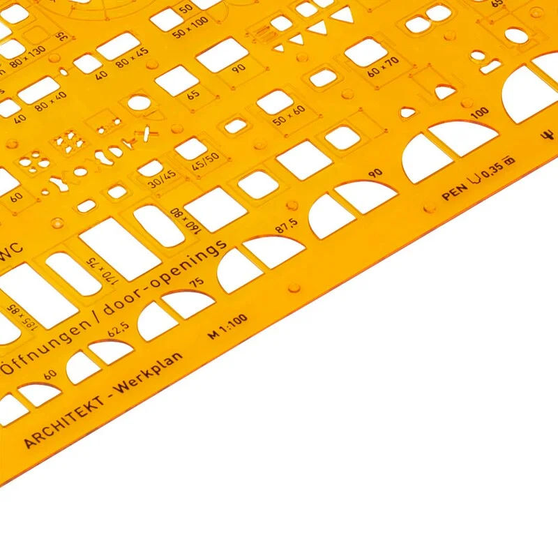 Diese Architekturschablone wurde speziell für architektonische und technische Zeichnungen entwickelt und ermöglicht das präzise Eintragen standardisierter Symbole. Ideal für Baupläne, Grundrisse, Schnitte und technische Projektdokumentationen.