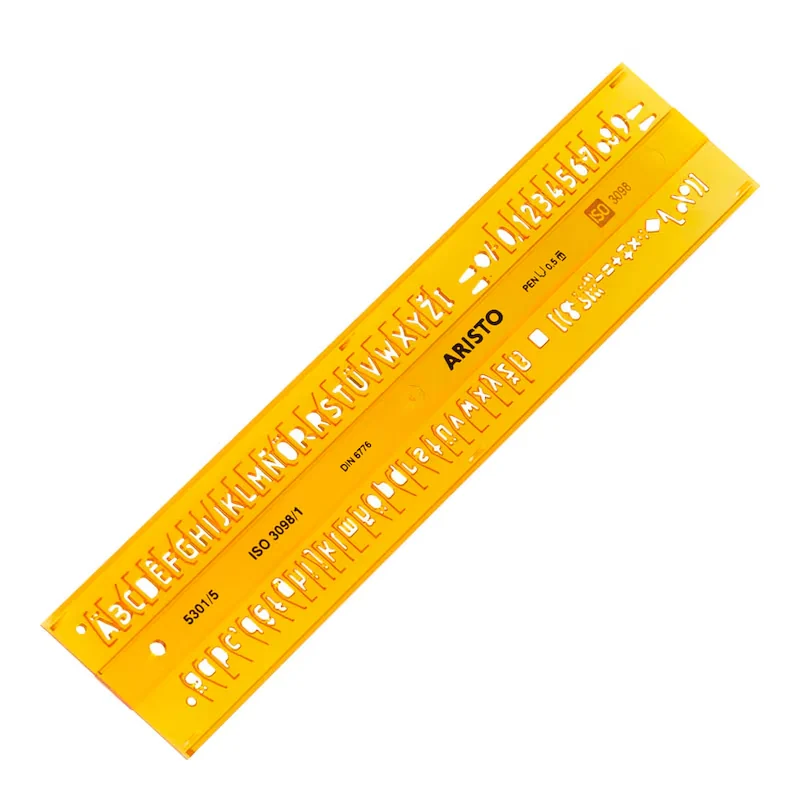 Aus gelb-transparentem Kunststoff gefertigt und mit Tuschenoppen ausgestattet, gewährleistet die Schablone eine saubere Linienführung ohne Verwischen. Randleisten und Abstandsklammern sorgen für gleichmäßige und exakt ausgerichtete Schriftzüge.