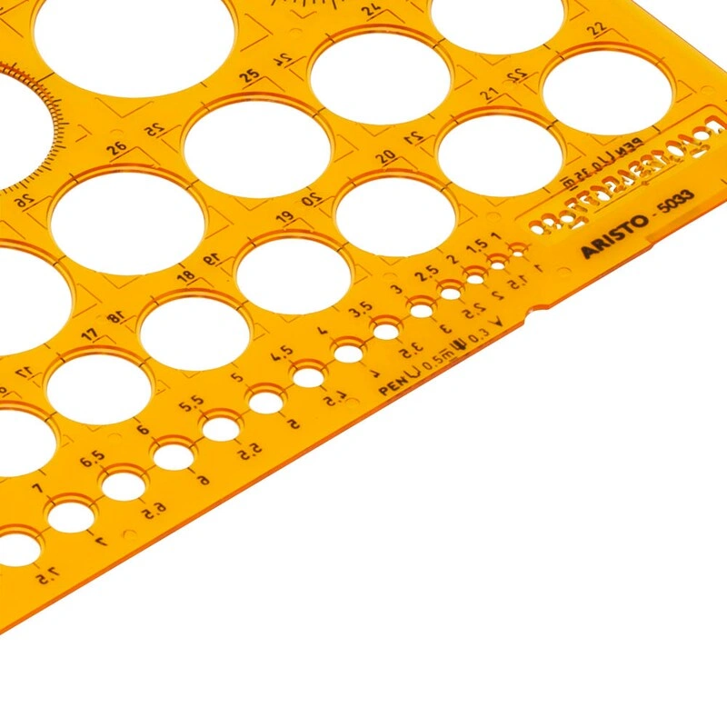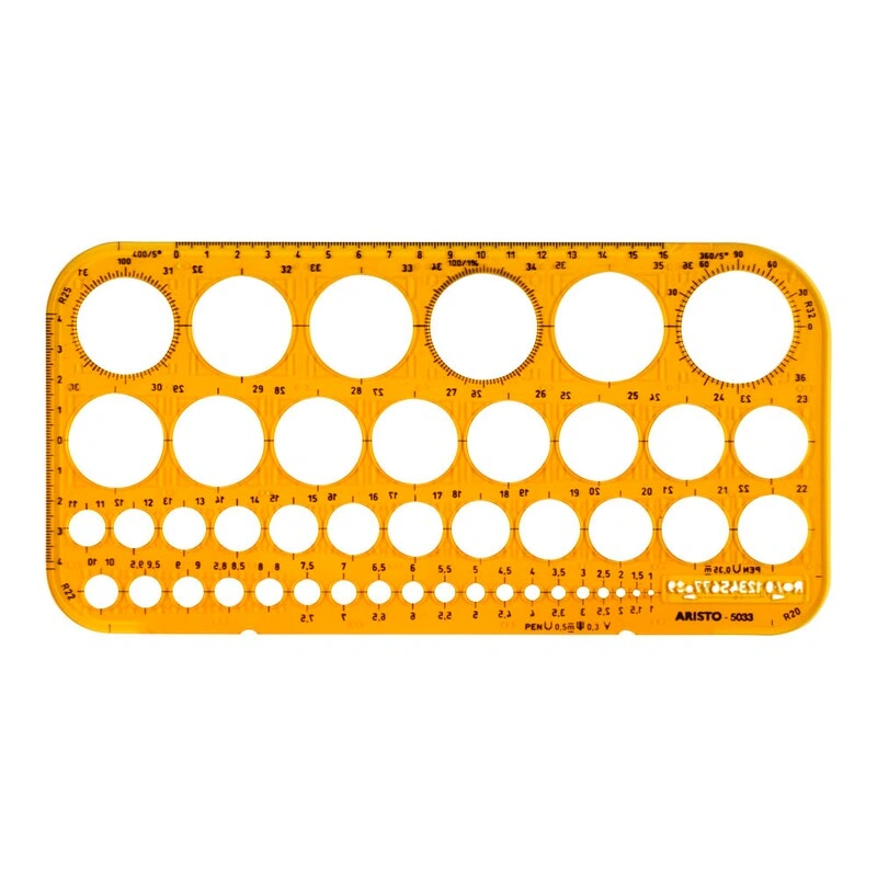 Zeichenschablone zur exakten Konstruktion von Kreisen und Radien in technischen Zeichnungen, Architektur- und Bauplänen. Durch das klare Layout eignet sie sich hervorragend für präzises Arbeiten in Ausbildung, Studium und professionellen technischen Bereichen.