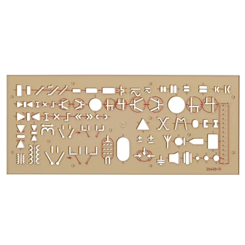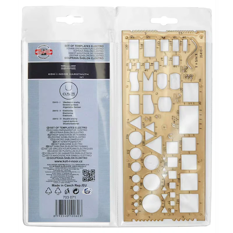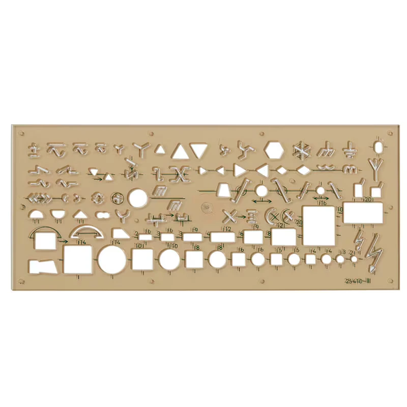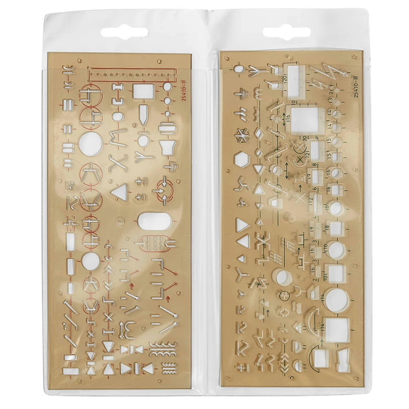 3-teiliges Zeichenschablonen-Set für Elektrotechnik und technische Situationszeichnungen. Die klar strukturierten Symbole und Formen ermöglichen effizientes Arbeiten ohne langes Suchen. Ideal für Ausbildung, Studium und berufliche Planungsaufgaben.